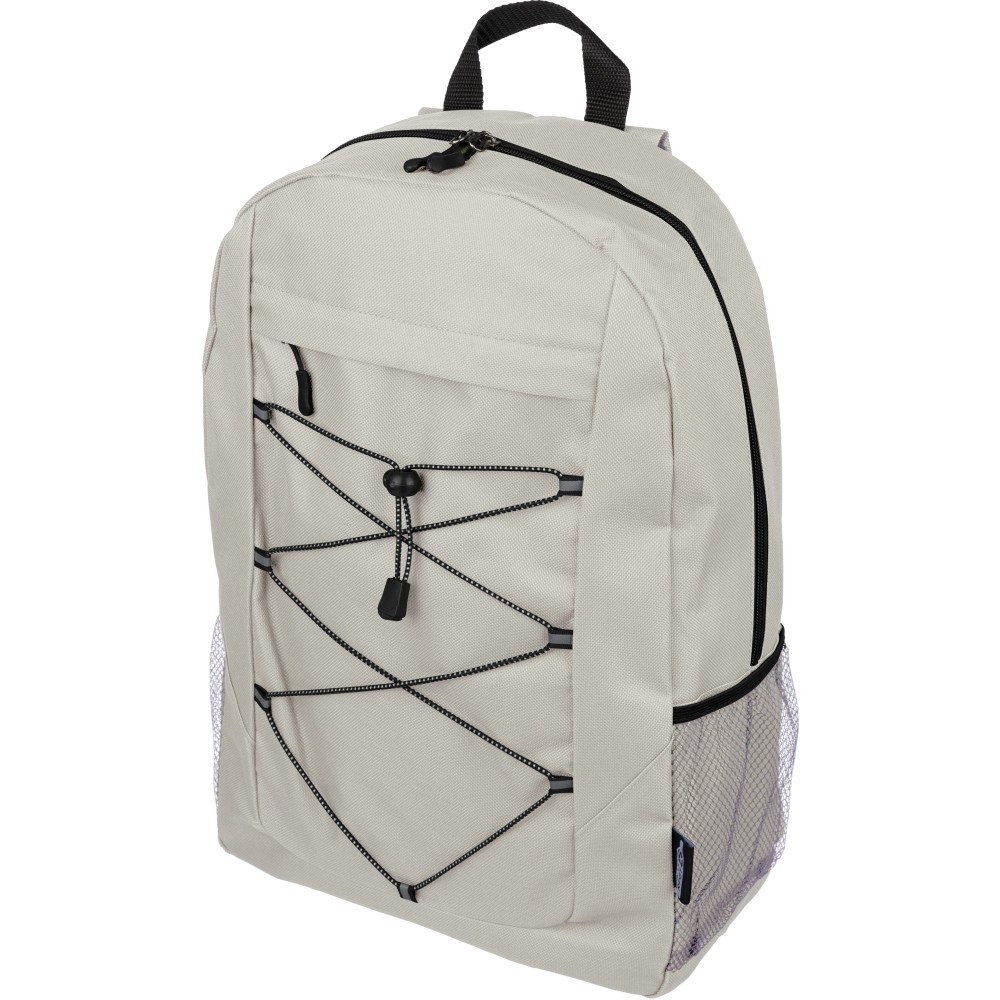 RPET poliészter 600D anyagból készült hátizsák húzózsinóros záródással és nagy cipzáras fő rekesszel. Hálós oldalzsebekkel, rugalmas elülső pántokkal, dekorációhoz kialakított kis elülső cipzáras zsebbel és állítható vállpántokkal rendelkezik. A terméken rPET alapanyagra utaló címke található.