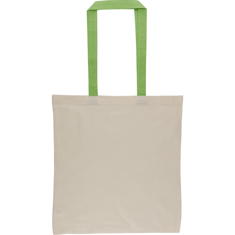 Oeko-Tex minősítésű, 140 g/m2 pamutból készült bevásárlótáska natúr színben, színes fülekkel. Mérete 38 × 42 cm, a fülek hossza 70 cm, szélessége 2,5 cm. Oeko-Tex címkével ellátva.