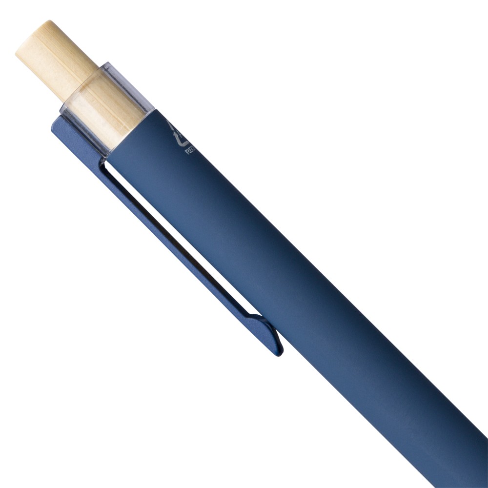 Újrahasznosított alumíniumból készült golyóstoll bambusz nyomógombbal és AS műanyag díszítéssel, fém klippel és a toll színével harmonizáló műanyag tollheggyel. A tolltesten lézergravírozott recycled (újrahasznosított) alapanyagra utaló logó található. Megközelítőleg 800 méter íráshosszúságú, kék színű tollbetéttel.