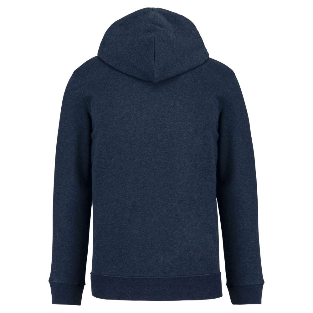 85 % bio, fésült pamutból és 15 % újrahasznosított poliészterből készült. Unisex. Egyenes szabás. Méretcímke organikus pamut és újrahasznosított poliészter logóval. LSF (Low Shrinkage Fleece: előzsugorított polár) kezelés. Kapucni. 1x1 bordás szegély és kézelő. Duplatűzés a kézelőn, a szegélyen és a nyaknál. Szalagozott nyakbelső hátul. Bélelt kapucni, a nyaknyíláson nincs felülvarrás, csak egy megkötés, hogy a húzózsinór a felső részen maradjon. Kerek húzózsinór a kapucnin fém véggel. Kenguru zseb. Nincs márkajelzés a nyakrészen, csak egy méretcímke a könnyű dekorálás érdekében. Karton függőcímkével érkezik, amely felsorolja a termék előállításához felhasznált környezetbarát anyagokat. Organikus pamutfonal. OEKO-TEX N CQ1007/7 STANDARD 100 tanúsítvánnyal rendelkezik. IFTH. 350 g/m2.