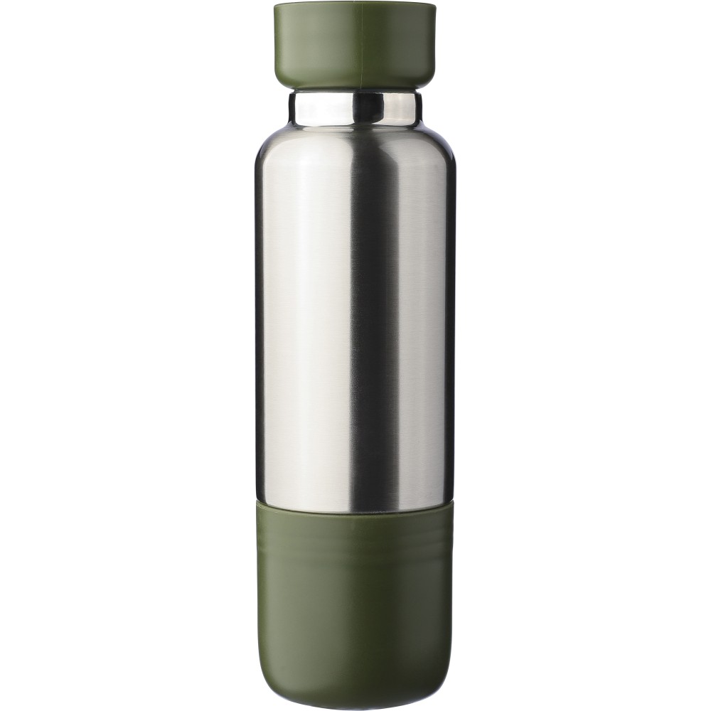 Duplafalú rozsdamentes acél kulacs, 500 ml-es. 304-es rozsdamentes acél belsővel és 201-es rozsdamentes acél külsővel. Átlátszó rekesszel ellátott PP csavaros kupakkal, cserélhető poliészter csuklópánttal, valamint egy 200 ml-es PP pohárral az alján. Ezüst színű felület matt részletekkel. Csomagolása barna papírdoboz.